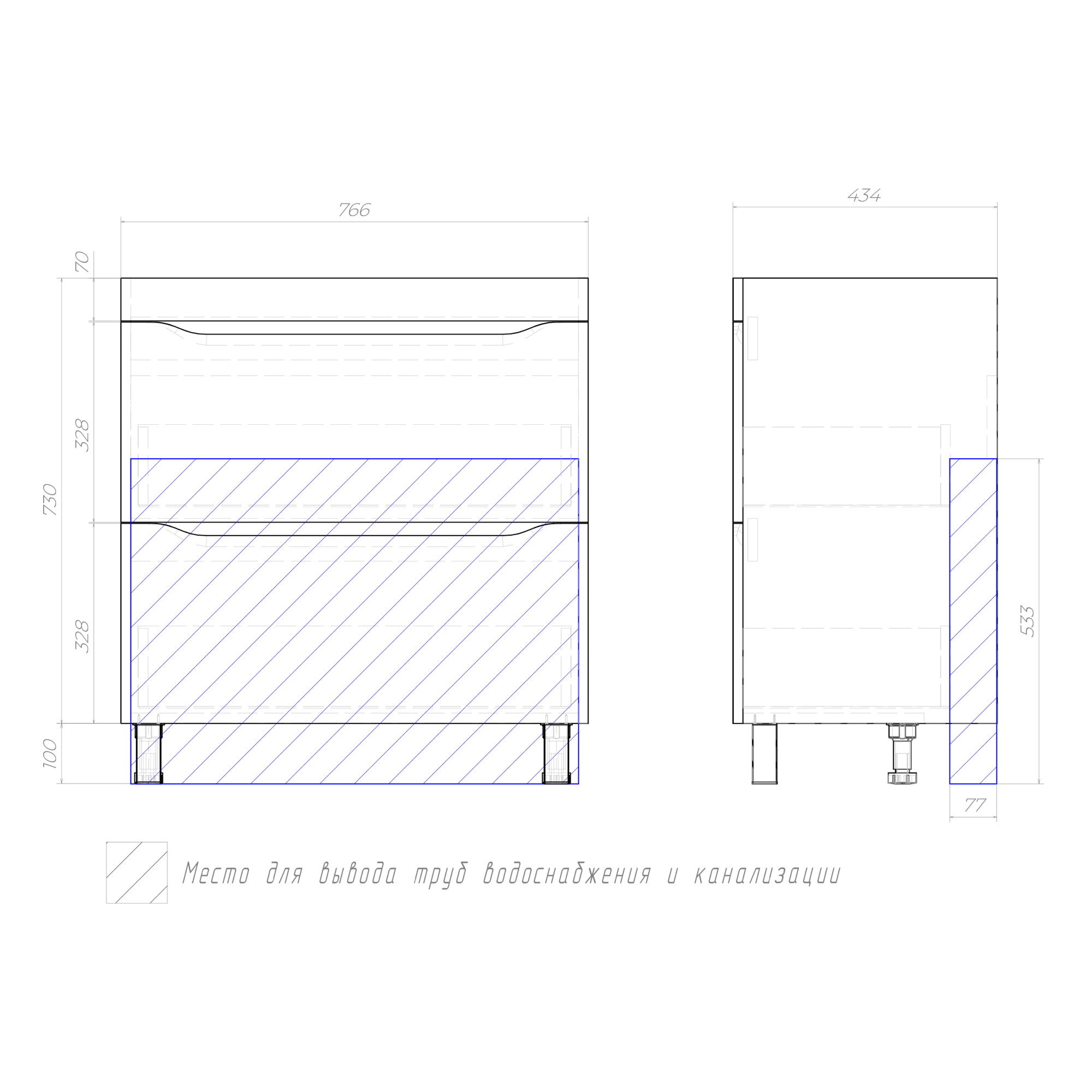 Внутренняя комплектация товара: 2 ящика, выдвижной органайзер для мелочей, направляющие шариковые полного выдвижения, 2 опоры квадратные регулируемые; 2 кухонные опоры, 1 сифон
