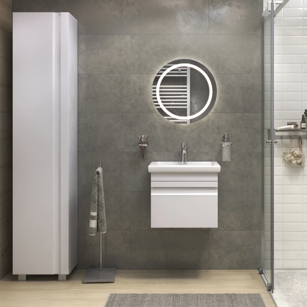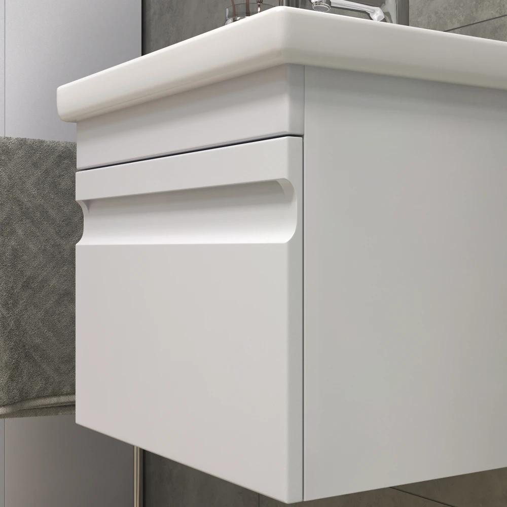Материал корпуса: влагостойкая ЛДСП Материал фасада: ЛМДФ в белой пленке ПВХ Система хранения: 1 выдвижной ящик, шариковые направляющие полного выдвижения, интегрированная ручка